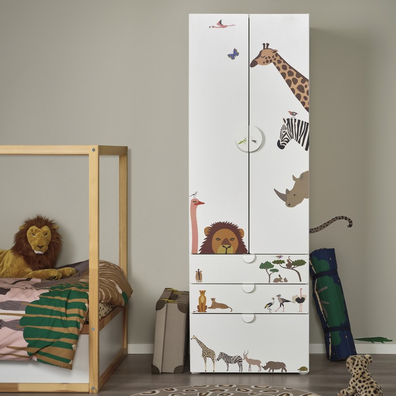 SANDLÖPARE 自黏壁貼三件組有多種草原動物圖樣,可隨意貼在牆面和家具上,讓全家人一起創造最喜歡的佈置方式。