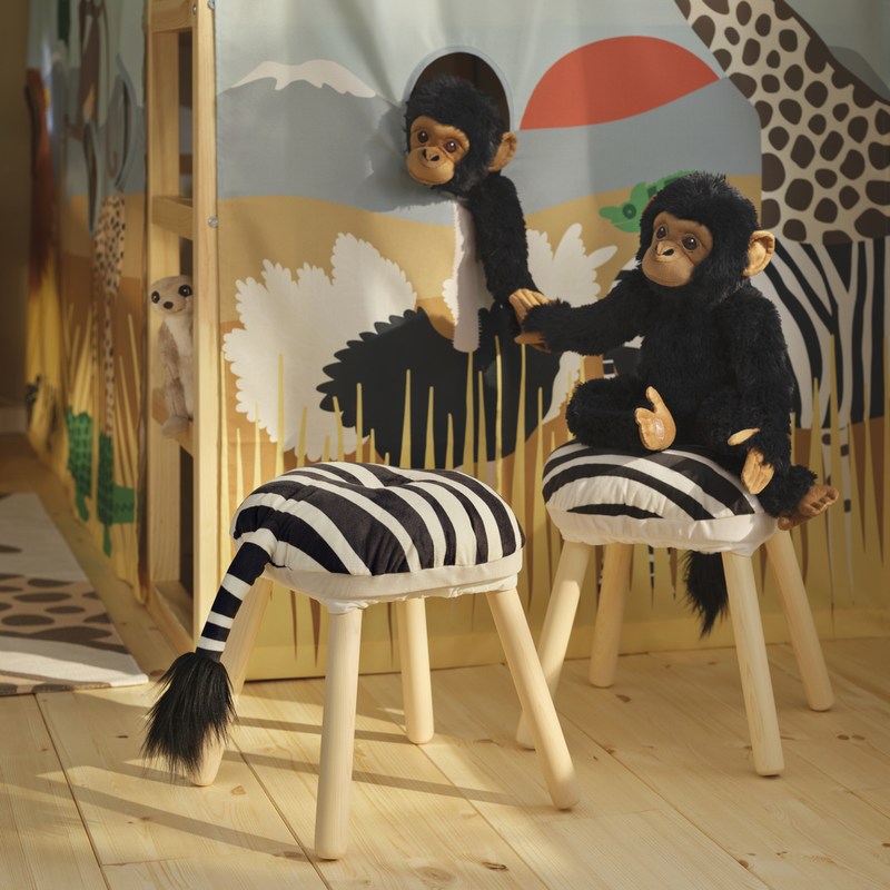 黑白相間斑馬紋、咖啡色斑點長頸鹿紋兩種圖樣的SANDLÖPARE 椅凳布套,延伸出俏皮可愛的尾巴,填充椅墊讓坐感更加柔軟,且使用回收聚酯纖維製成,方便清洗保養!