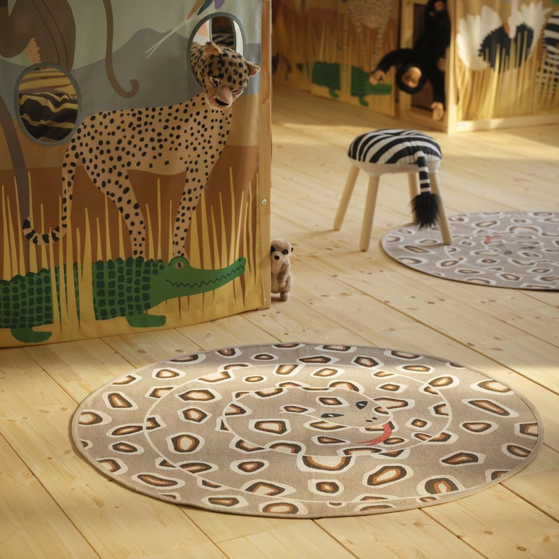 彷彿一圈圈的大蟒蛇盤繞的SANDLÖPARE 平織地毯,100%純棉材質親膚舒適,背面則有防滑塗層,踩上去就像走進探險基地。