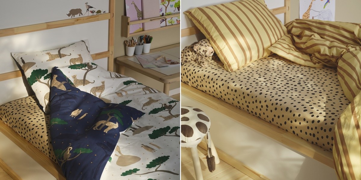SANDLÖPARE 被套附1個枕頭套 一面呈現白天的草原風景,翻個面就來到夜晚景象,體驗非洲大草原日夜變換的樂趣,可再搭配豹紋圖案的SANDLÖPARE 床包,讓臥室充滿小小冒險氛圍。收納也不無聊!