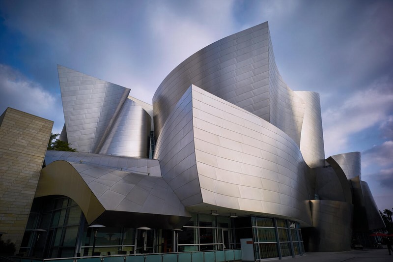 被形容為「音樂的建築、建築的音樂」落成於2003年的華特・迪士尼音樂廳,是解構主義建築的經典之作,也是洛杉磯最具代表性的城市地標之一。建築外觀由多片銀白色巨型鋼板錯落交織而成,自由奔放的動態弧線與凹凸曲面,波浪般的流線宛如迎風航行的帆船,高低起伏的鋼板則如音符的高低交錯,使整座建築彷彿凝結中的樂章,成為城市視覺的焦點。