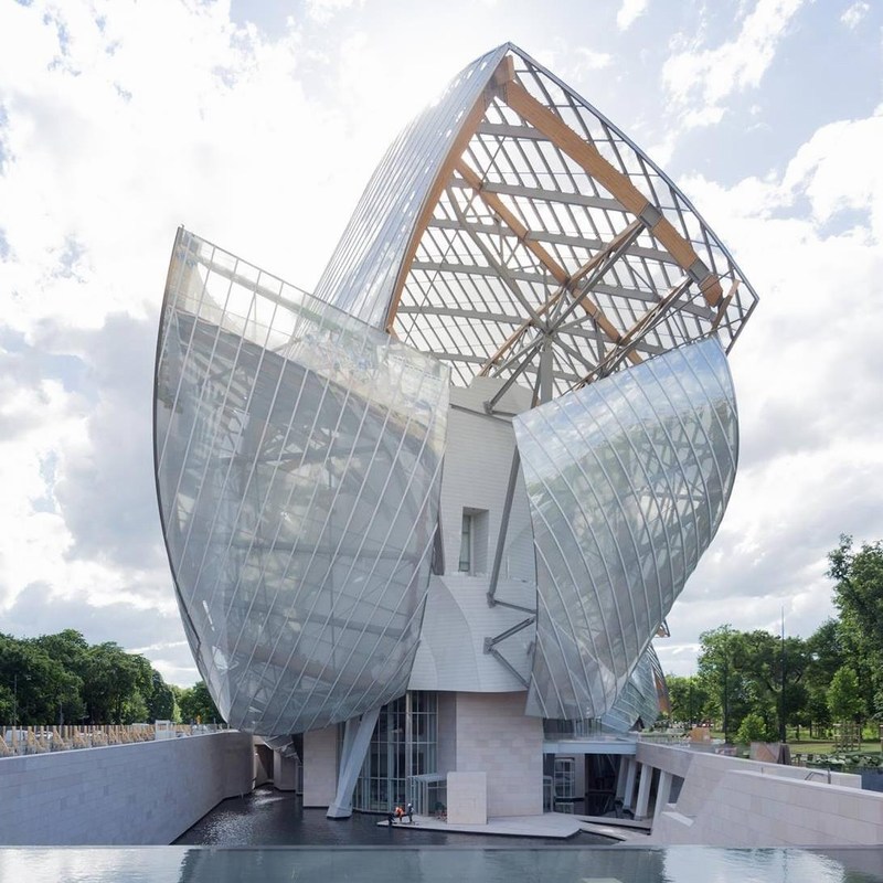坐落於巴黎市區的布洛涅森林公園(Bois de Boulogne)的Louis Vuitton 基金會由 LVMH 集團創立,是一座結合建築、藝術與設計的當代文化地標。在Frank Gehry操刀設計出獨特「玻璃帆船」建築。外觀以12片曲面玻璃帆組成,猶如乘風航行於水面、一艘透明的未來之船。捕捉如帆船在風中鼓起的詩意動態,讓原本冰冷堅硬的建築材料,在光影折射下彷彿擁有呼吸般的律動,展現其對有機線條的極致追求與挑戰常規的創作野心。館內收藏展示 LVMH 集團主席貝爾納・阿諾的私人藝術珍藏,並定期舉辦國際級特展、藝術講座與音樂演出,成為藝術交流的重要平台。建築同時融入永續理念,具備雨水回收與地熱利用系統。