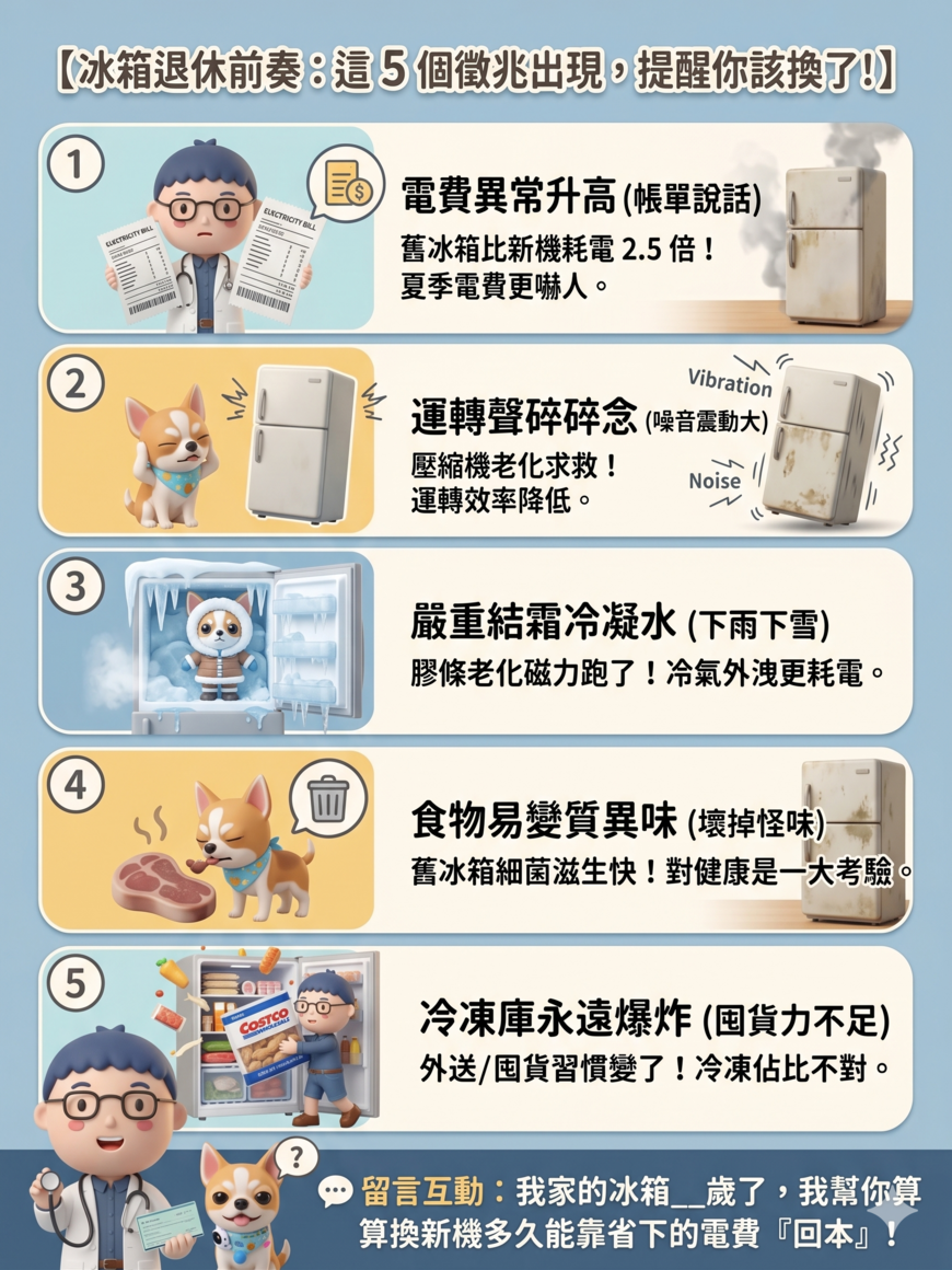 - 變頻技術的極限: 老舊冰箱(10 年以上)的耗電量可能是新變頻冰箱的 2 至 2.5 倍。對於長年插電的電器,這是一筆巨大的隱形支出。