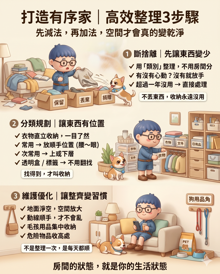 整理房間不僅是為了美觀,更是為了提升生活效率與心理舒適度。要「有效」整理,建議遵循「先減法、後加法」的邏輯,將過程分為三個核心階段: