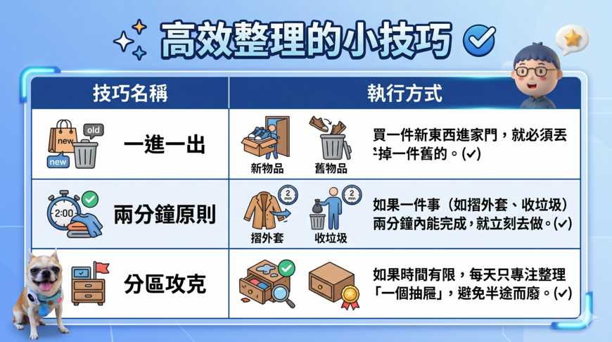 - 集中處理: 不要按「房間」整理,要按「類別」整理(例如:先整理所有衣服,再整理書)。