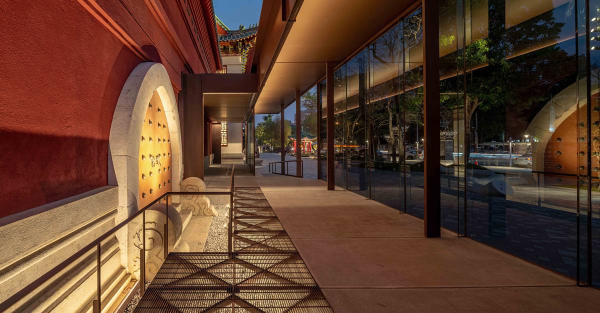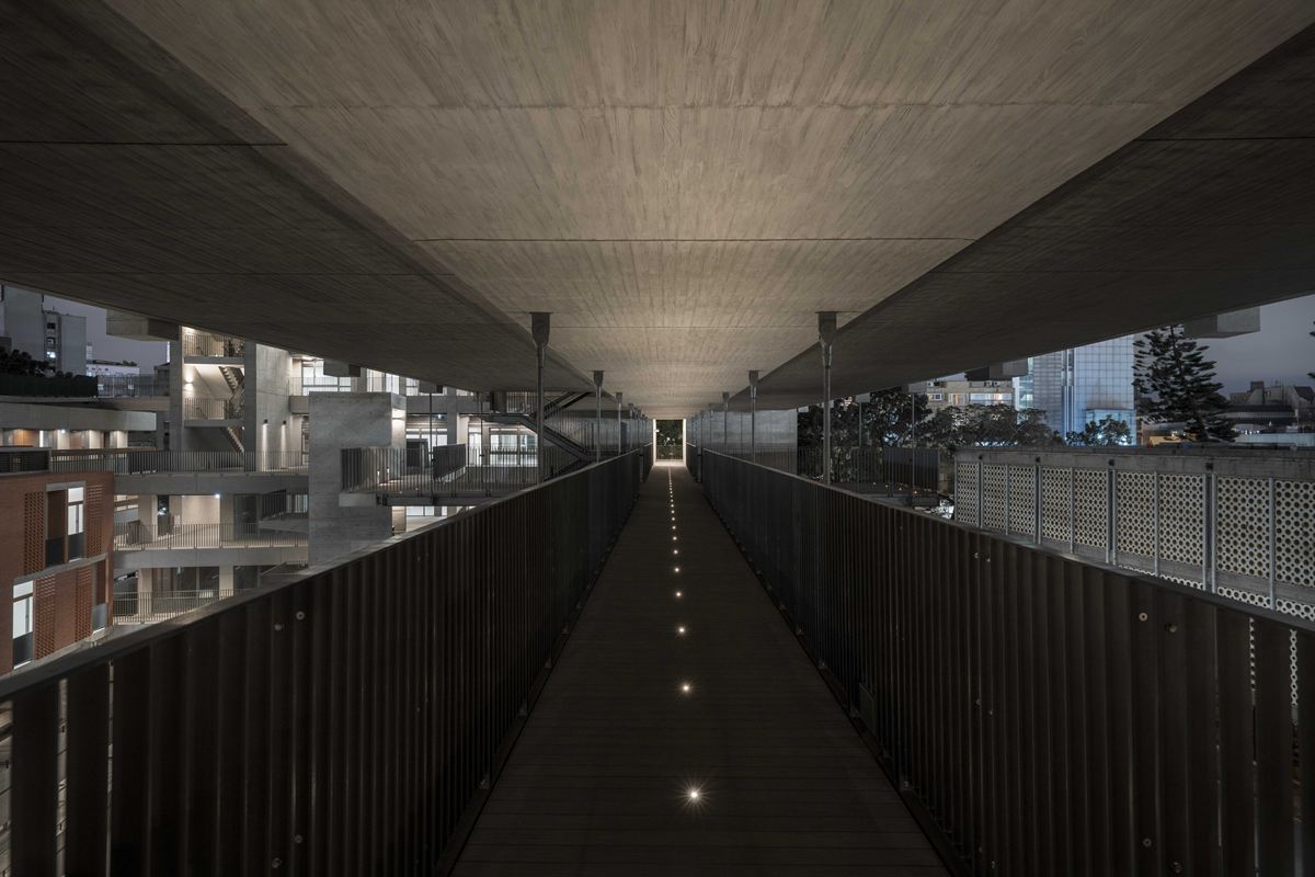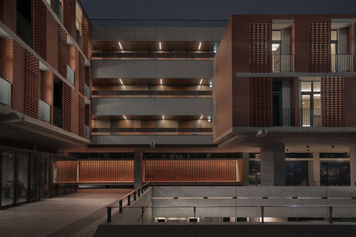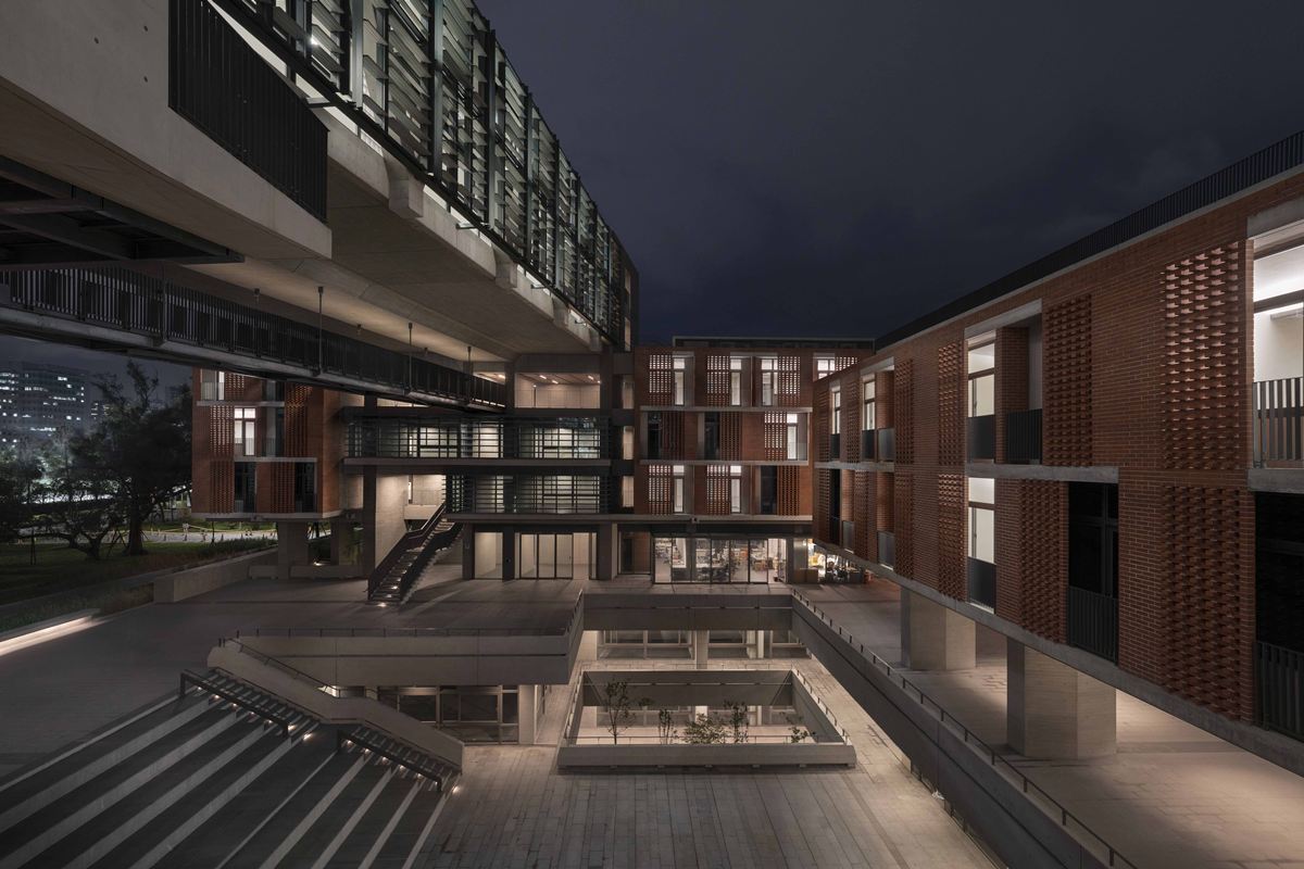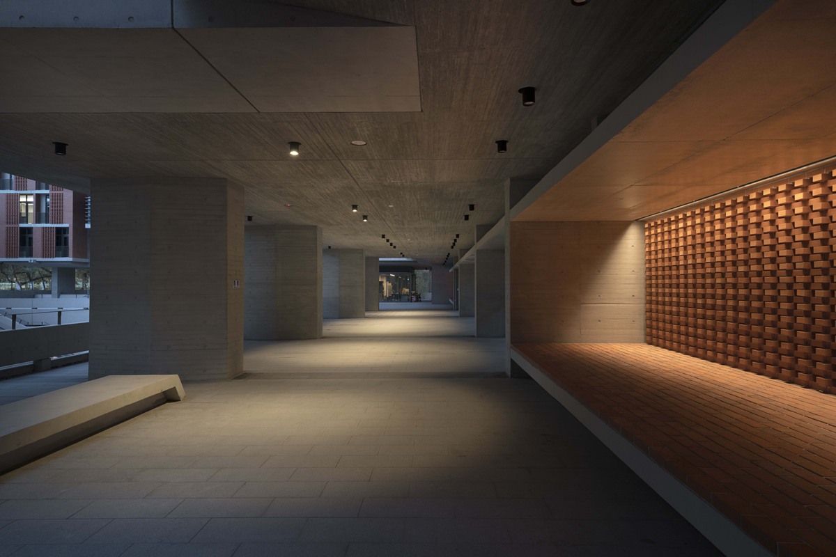 延續建築設計的思維,不另設外牆照明,以內斂、溫柔的光線,巧妙點亮建築內部,藉由室內透光的細膩層次,烘托學術場域的沉靜厚度。透過光陪伴師生行走、凝視與停留,讓日常路徑被重新看見;照明引導空間動線,創造溫潤舒適的交流氛圍,讓光、人與場域彼此交互交織,持續照亮知識與探索的道路。