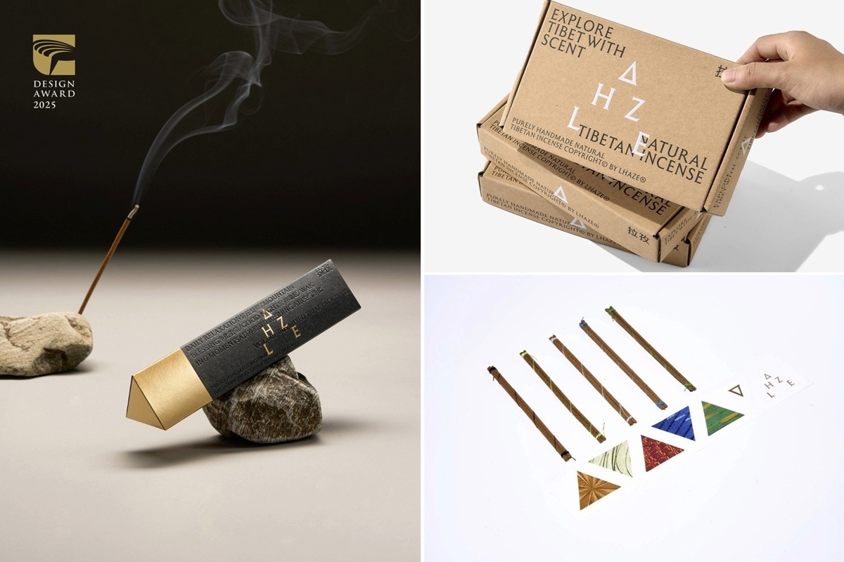 根本設計的「拉孜」,是為喜馬拉雅高原文化藏香品牌打造的識別與包裝,其將字母「A」化為金色山頂符號,凸顯品牌「山頂之光」的寓意,並結合經幡色系的三角形外包裝,塑造出兼具文化象徵與獨特識別性的品牌形象。