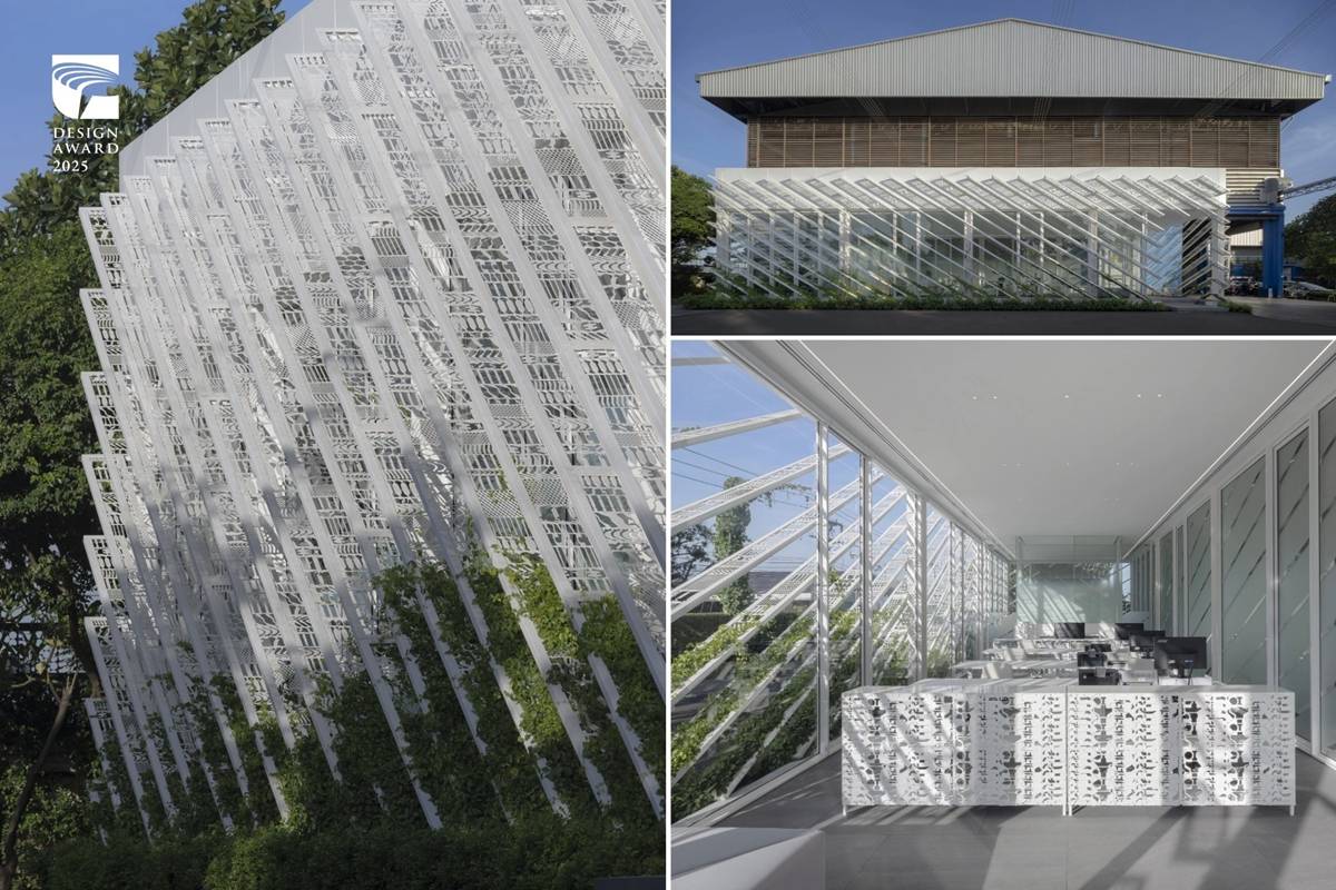 泰國 AUN Design Studio 為鋼鐵廠設計的辦公空間「“No Time to Waste” Office」,運用工廠生產過程中耗損的金屬廢料,轉化為建築構件與客製家具,如廢棄金屬板經穿孔處理後成為裝飾立面,亦可作為攀爬植物的棚架,令空間可隨光影與綠意景觀產生不同變化,不僅是循環設計的實踐,也展現工業廢料在建築應用的創新美學。