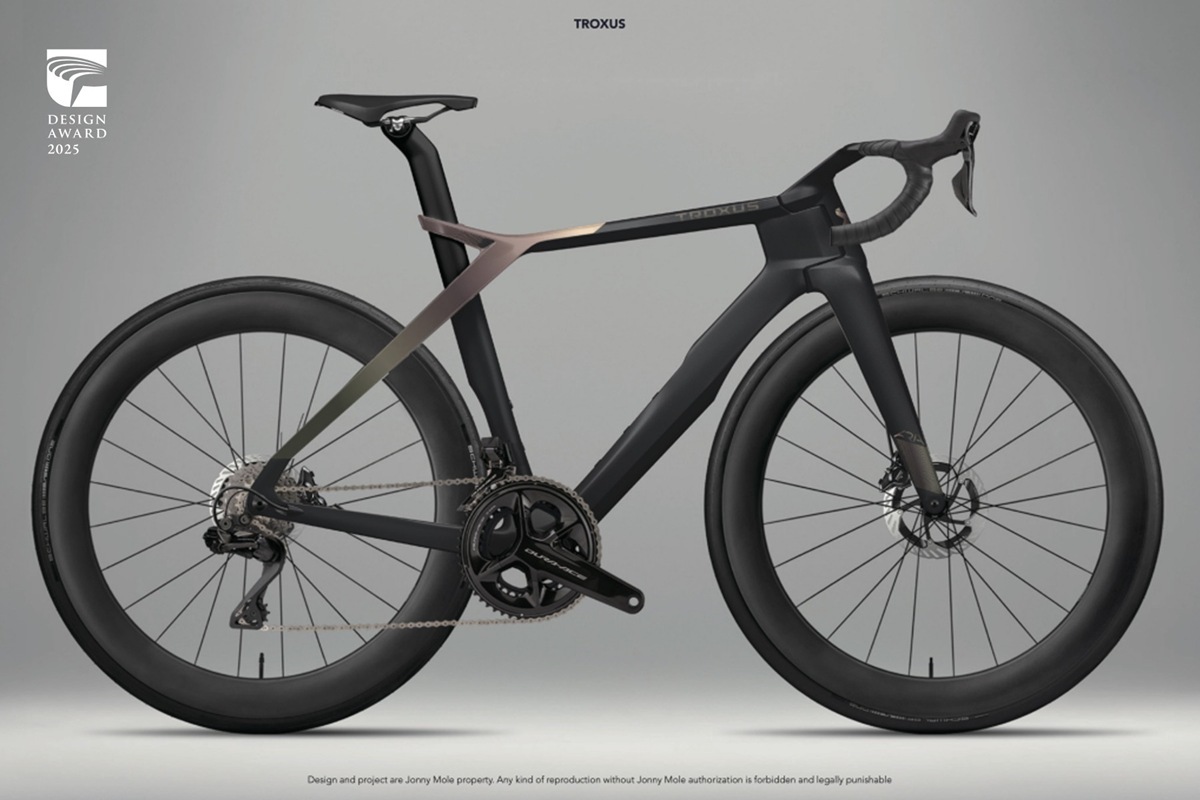 歐美知名自行車品牌 TROXUS 創速師的「ARIA 靈氣」,採碳纖維一體成型車架,上管與後上叉間具特別加強結構,不僅形塑高識別度外觀,同時提升剛性與減震效果,結合隨光變化的特殊塗裝與空力化車身,展現兼具性能與美學的公路車設計。