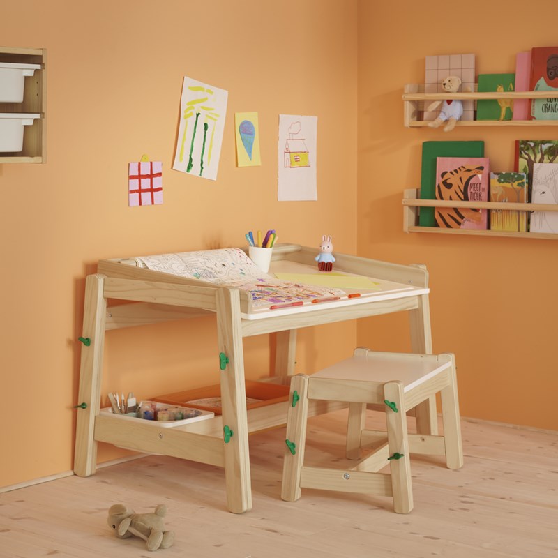FLISAT兒童書桌可依需求調整三段高度,讓孩子自由變換姿勢不受限,無論畫畫、寫字或動手勞作都能輕鬆上手;桌面可傾斜設計,可以為孩子調整最適合的角度,搭配貼心溝槽,不用擔心文具滑落。桌面附有適用MÅLA紙捲的支架,隨手就能展開創作,下方還可搭配TROFAST收納盒,收納玩具與用品更方便,打造專屬的創作小天地!
