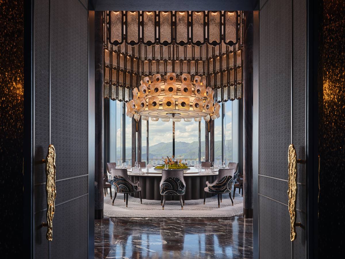 六間直面江景、層高六米的私宴包廂,以其尊貴氣派與精緻設計彰顯非凡格調。其中,「錦玉」包廂可容納20人,設計靈感源於東方園林美學。16根整石切割的紫山水奢石立柱環繞成一座八角亭,寓意八方來客—呈現溫州千年商港海納百川的精神風貌,宛若一座宋代園林中的精緻亭台。三重琉璃鳳翎燈高懸亭心,牆面則以手工玻璃雕刻雁蕩山的起伏紋理,營造出獨特的空間意境,無論是商務宴請還是家族聚會,盡顯高端雅致。