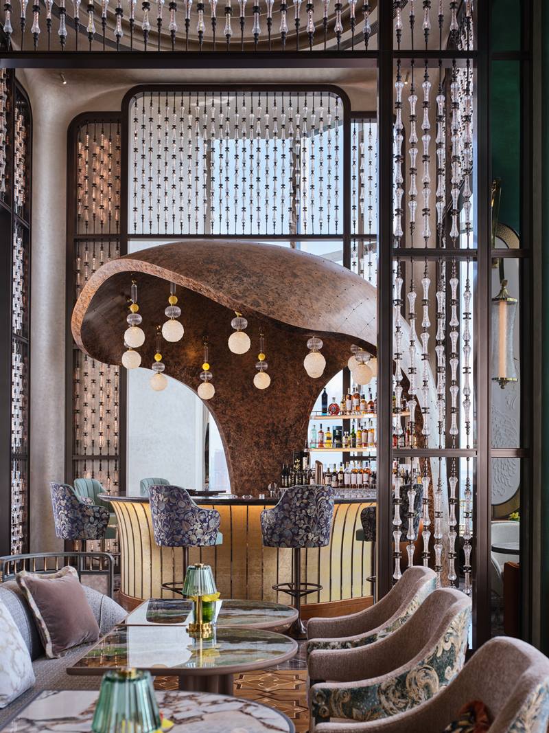 餐廳內設有雲端酒吧「潮汐」,焦點落在貝殼造型的中央吧台。吧台垂掛珍珠式樣吊燈,增添靈動優雅的氣息,而吧台本身採用氧化銅材,隨光線變化呈現出流動的金屬紋理,如同甌江波光粼粼,夕陽下更是閃爍金色光輝,宛如溫州的自然與文化交融於空間設計之中。