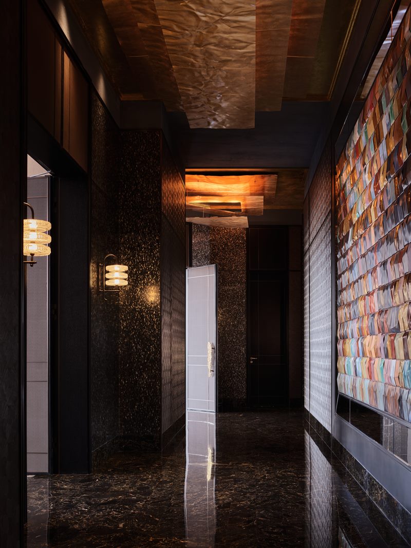 作為百工之鄉的溫州,其傳統工藝嵌螺技藝精美絕倫。通往包廂的走廊設計別具巧思,牆面分別以七彩甌陶和閃耀著金銀光芒的「溫州螺鈿」裝飾,低調中透出華麗,營造出沉穩大氣的迎賓氣氛。