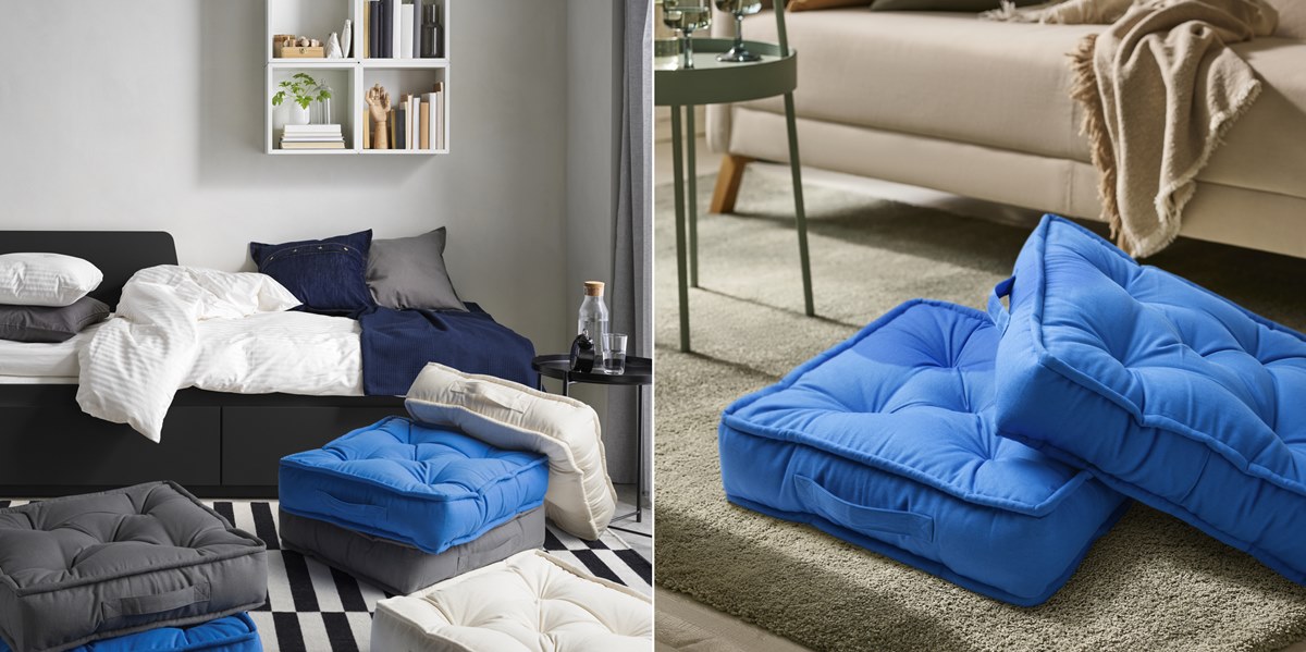 三五好友到家一起觀賽,位置不夠,就用GURLI坐墊來補位,厚實柔軟,鋪在地上就能自在坐定,兩側還設有把手,方便隨時搬動;藍色系視覺與應援色相呼應,方正造型也讓人聯想到球場上的壘包,讓居家角落自然融入比賽氛圍。