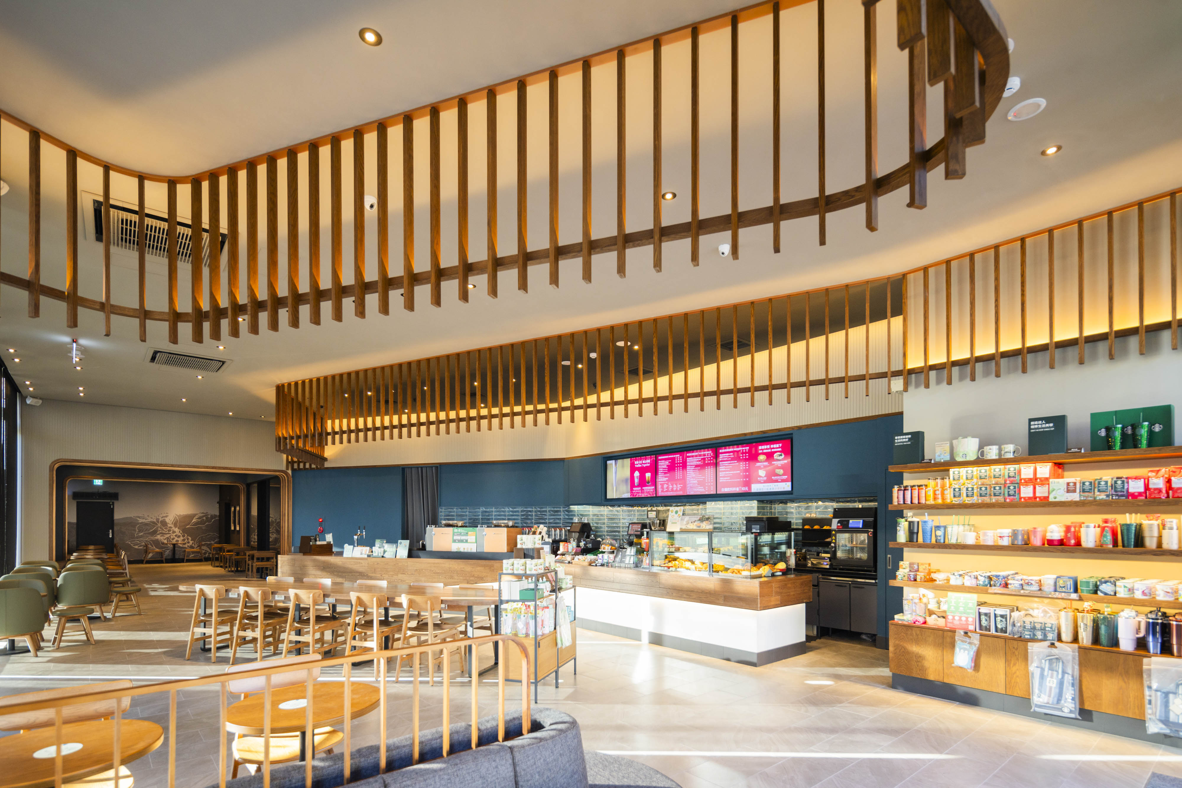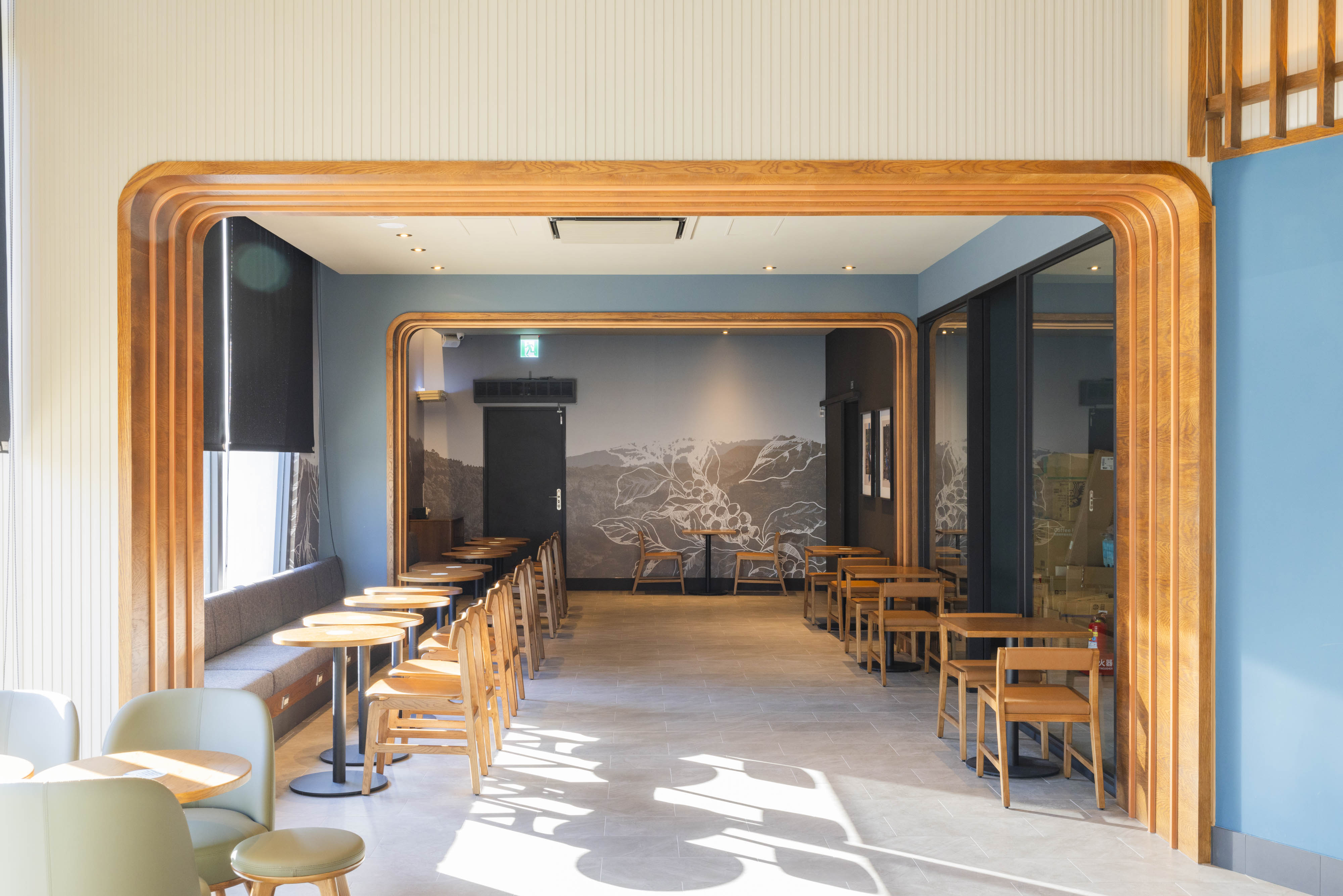 門市外觀延伸自后里的歷史印象與馬場意象,整體造型宛如馬鞍,展現穩定而優雅的姿態。室內設計以挑高天花迎接自然光,讓光線貫穿建築,營造明亮通透的氛圍。靈感源自咖啡原產地的山脈線條,傾斜的造型象徵咖啡的能量與生命力,與周圍客席區形成對比又和諧的空間,讓顧客在靜謐細緻的氛圍中,享受悠閒時光。