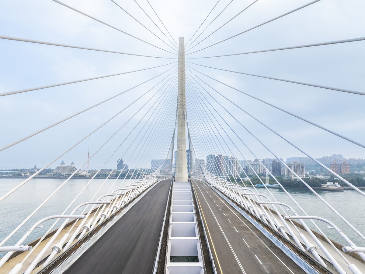 ▲主橋塔放射狀的斜拉鋼索,形成具地標性的「力與美」連結。(圖片來源/中華民國交通部公路局)