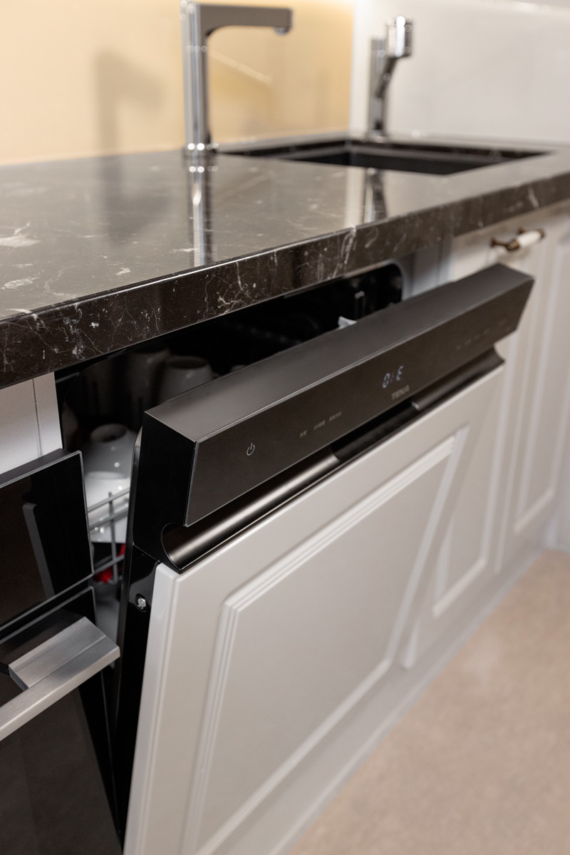 享用完豐盛大餐,自然會產生大量油汙碗盤,必須儘快清洗,以免異味殘留在餐具上。此時,誰來清洗碗盤,往往成為令人頭疼的難題。郁琇琇設計總監表示:「為了化解人際矛盾,維繫和睦家庭關係,大部分高端客戶都會裝設洗碗機。」選擇時,除了考量基本的給排水配置、電源位置、使用者身形、使用者習慣外,她也會綜合評估品牌信譽、材料品質、外觀設計、功能完備性、安裝服務、保固機制等細節,給予屋主最佳建議。