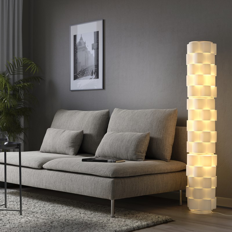 柔和燈光是營造氛圍的關鍵,LÅGTRYCK落地燈透過格紋剪裁呈現出不同層次的光影變化,散發溫潤的光芒,讓居家時光更顯放鬆自在。