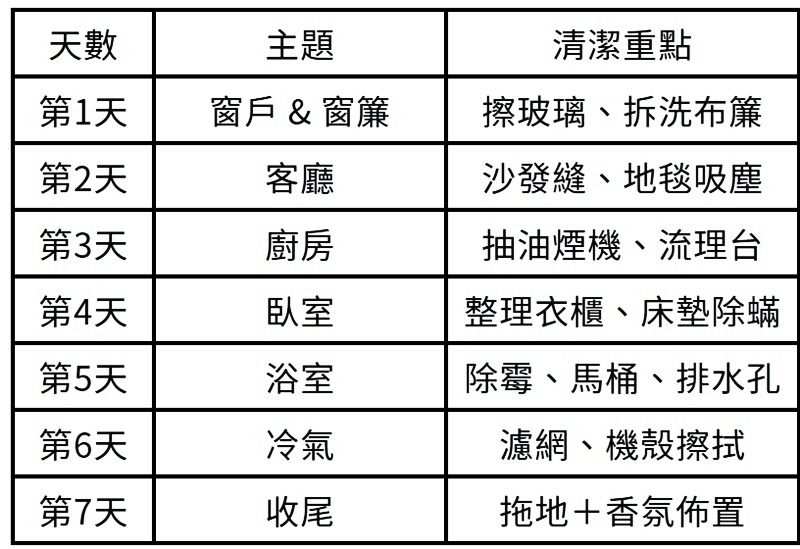 大掃除最可怕的是「一次全部來」,但其實只要「每天一點點」就能看見明顯效果。只要照著 以下的「懶人 7 天計畫」,一週後你家就能從混亂狀態變得明亮如新。