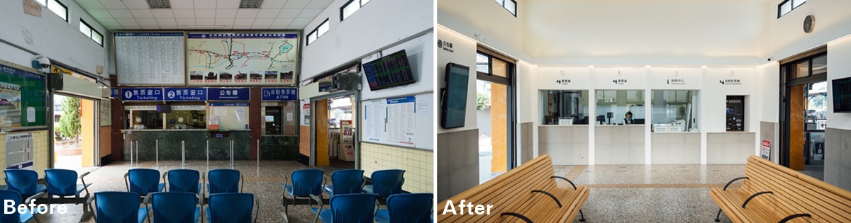 ▲候車室改造前後對照。重新梳理候車室中的動線配置,並新增無障礙服務櫃檯,整體色調以低飽合色系搭配,營造清爽沉靜的氛圍。(圖片提供/台灣設計研究院)