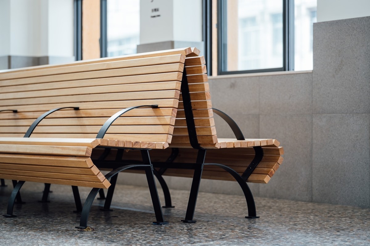 走入站內,候車室以灰、白等低飽和色系為主調,搭配溫潤的磨石子材質,延續百年車站靜謐沉穩的氣質。為二水車站量身打造的兩張鋼條木板椅,設計取材自同期建造的姐妹站──泰安站與銅鑼站的木板椅造型,悄悄串起鐵道歷史的記憶。