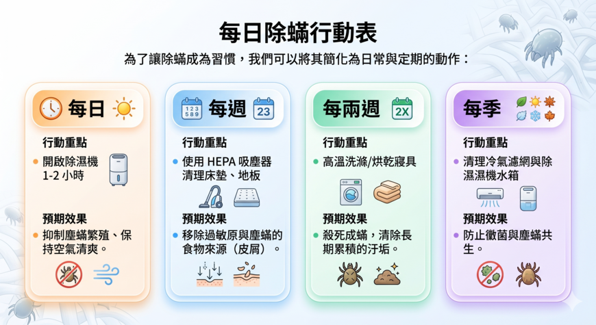 達人建議: 每天使用除濕機,並將濕度鎖定在 45%-50%。特別是下雨天,適度除濕是抑制塵蟎最有效的方法。