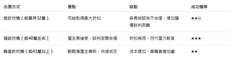 這個表格可以幫助首購族快速了解「不同出價策略的利弊」,決定是追求折扣、保守談判,還是優先快速成交。