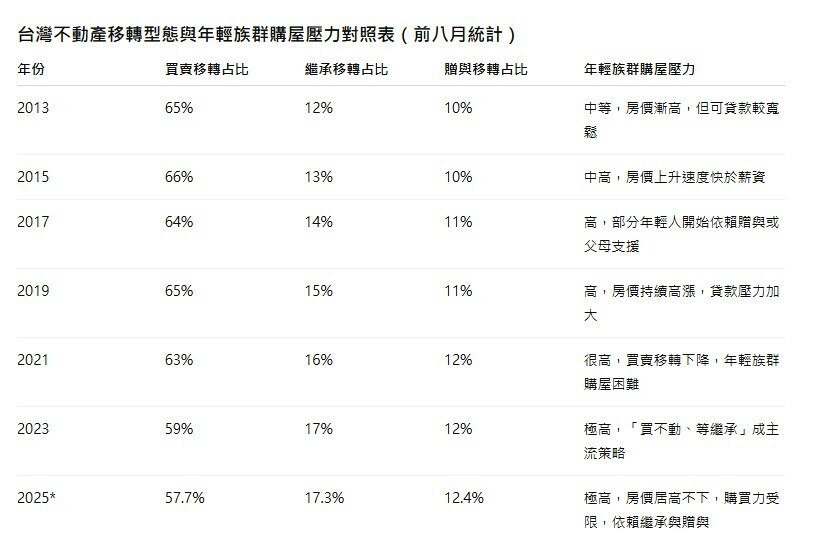 台灣房市正在悄悄轉型。隨著房價持續居高不下,今年前八月全台不動產移轉型態顯示,「買不動、等繼承」正成為年輕世代取得房產的新趨勢。內政部統計指出,今年買賣移轉占整體不動產移轉比重僅 57.7%,創下歷史新低;相對地,繼承與贈與分別占 17.3% 和 12.4%,雙雙創下新高。換句話說,每 10 件不動產移轉,就有近 3 件是透過繼承或贈與而非直接買賣完成。