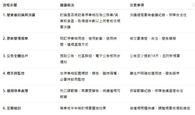 管委會若決定將原訪客停車格改為公務車或貨車卸貨專用區,需先行公告並更新管理規章,清楚規定使用對象、使用時間以及違規處理方式。公告及規章生效後,再遇住戶違規停車時,即可依法要求移車或處理違規,降低爭議。
