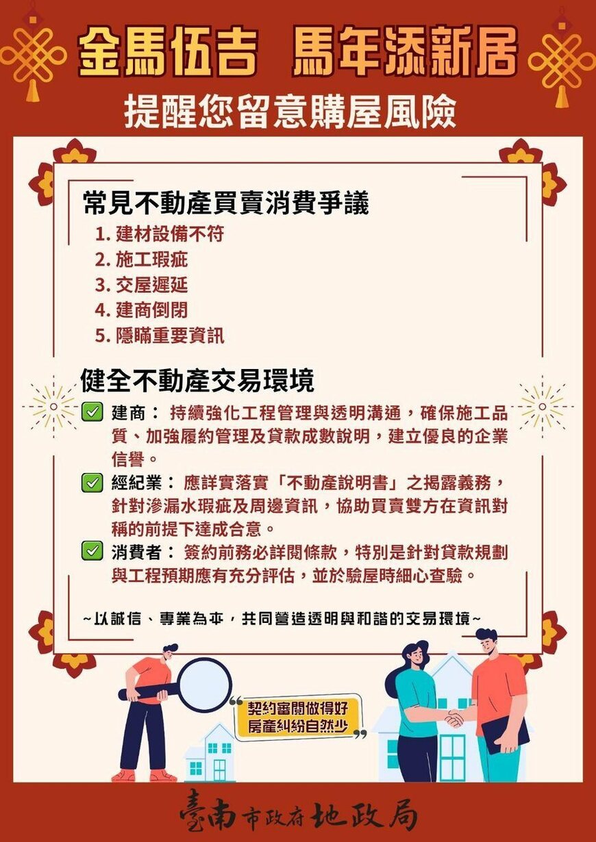 法制處提醒,民眾購屋前應慎選體質穩健、信譽良好的建商,並善用「契約審閱權」,詳閱契約條款,特別是建材設備、施工標準、交屋期限等關鍵內容,才能保障自身權益。
