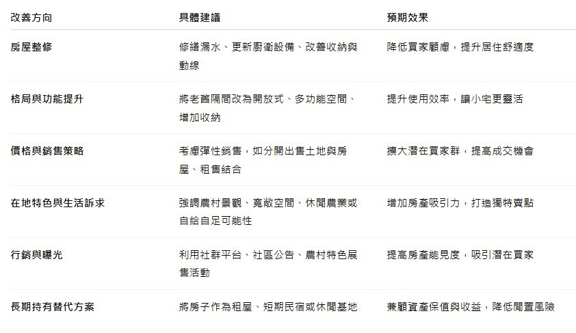 那麼,有沒有改善的方法?專家建議,可從「提升可用性與吸引力」著手。首先,整理房屋外觀與內部設施,如修繕漏水、更新廚衛設備、改善收納與動線,降低買家顧慮。其次,可考慮「分段或彈性銷售」策略,例如將土地與房子分開出售,或提供租售結合方案,增加潛在買家群。最後,善用在地特色與生活機能訴求,如農村景觀、空間寬敞、休閒農業可能性,都能讓房產在市場上更具賣點。