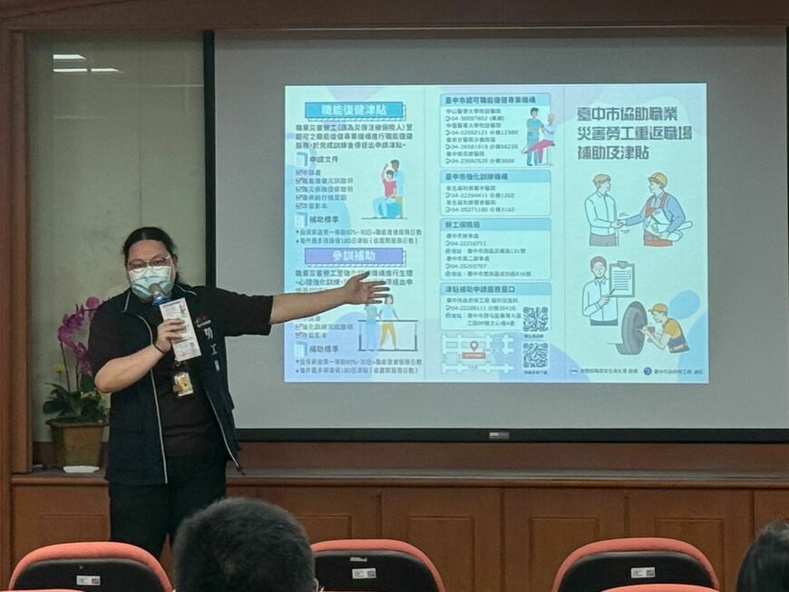 勞工局長林淑媛表示,舉辦這些宣導會就是希望讓大家更了解職災勞工可以運用的各種資源。比如說,職災勞工可以申請職能復健津貼,透過專業的復健服務慢慢重建工作信心和能力,一步步準備好回到職場。同時也鼓勵企業多關注職災勞工復工的需求,政府會補助公司為職災勞工添購必要的輔助設施,或是獎勵企業雇用經過認定還有工作能力的職災勞工。