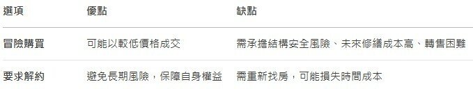 協商降價或修繕補償:若仍想購買,可要求大幅降價,或由賣方負擔未來修繕費用(需以書面約定)。