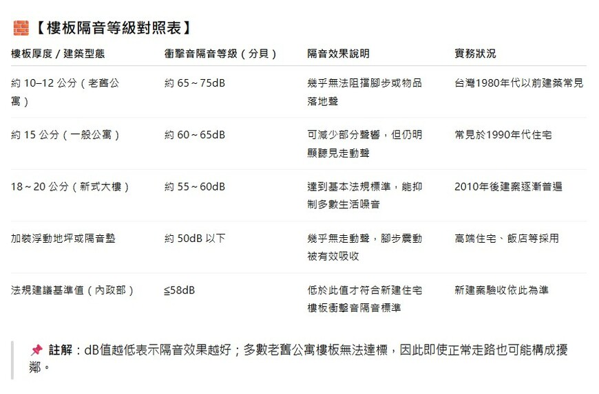 從建築角度看,台灣老舊公寓的樓板厚度多為15公分左右,隔音能力普遍不足。根據內政部《建築技術規則》,新建住宅的樓板衝擊音應低於58分貝,但多數老屋根本達不到。換句話說,即使是正常步伐,也可能讓樓下聽得清清楚楚。