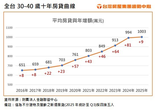 購屋族房貸壓力知多少?根據台灣房屋集團統計金融聯徵中心新增房貸資料顯示,30至40歲購屋主力客群,2025年前三季平均房貸金額已攀升至1003萬元,正式跨入千萬房貸時代,且相較十年前足足增加逾350萬元!進一步觀察該族群近十年來的房貸壓力曲線,從2017年平均房貸659萬元,年增僅8萬元,自2020年起明顯放大,動輒年增40至50萬元以上,2024年更一舉暴增逾80萬元,不過來到2025年前三季,平均房貸相較前一年僅增加約9萬元,增加金額回到10年前的個位數水位,房貸增壓速度似乎已有趨緩跡象。