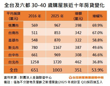李家妮表示,反觀台北市,雖然十年間平均房貸增加462萬元,增額為六都最高,但因基期原本就高,增幅僅3成多,成為六都中房貸壓力增幅相較溫和的區域,也讓雙北以外的青壯族群,房貸負擔增壓速度超越首都圈。