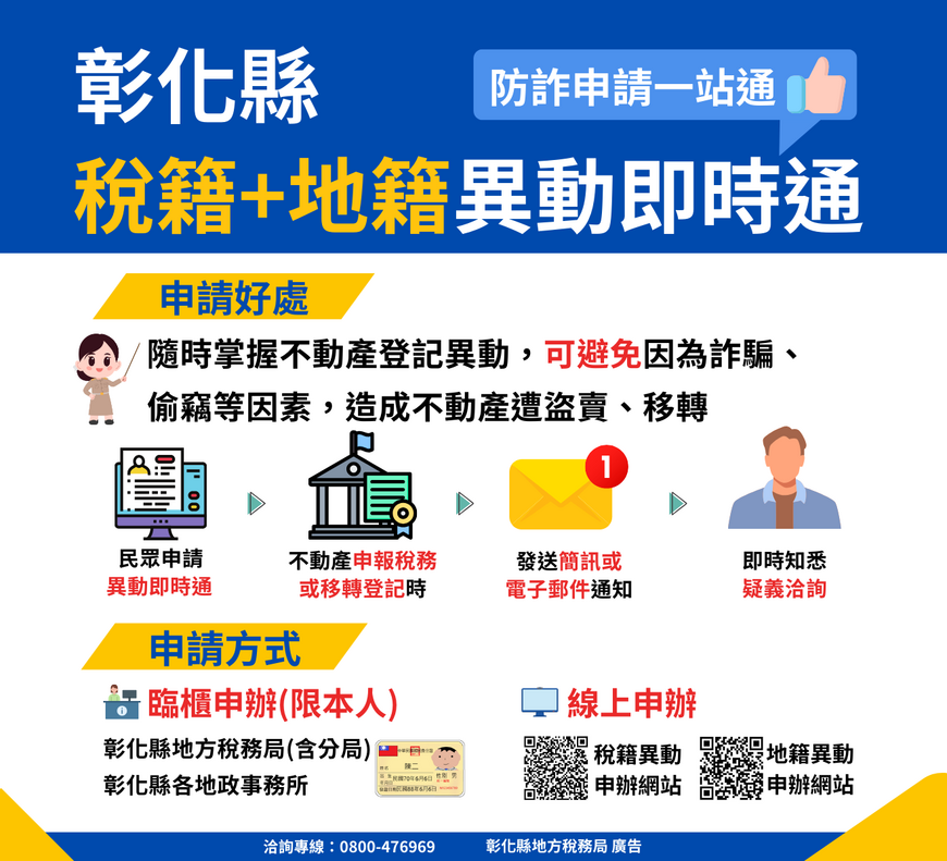 彰化縣政府為強化不動產交易安全及簡化民眾申請流程,彰化縣地方稅務局攜手地政機關合作,正式推出「稅籍異動即時通」與「地籍異動即時通」一站式整合申請服務,提供民眾更完整即時的不動產異動通知機制。