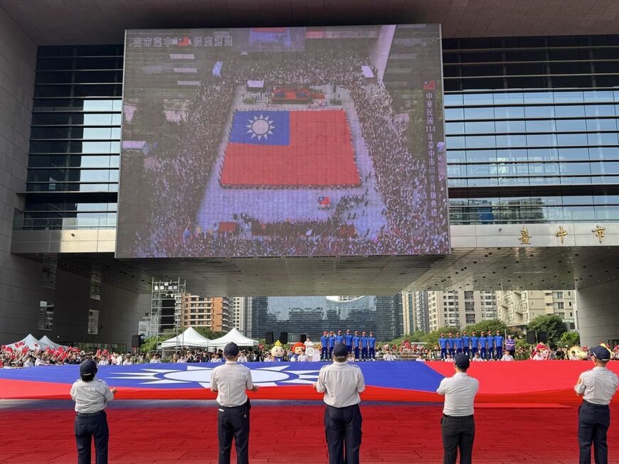 台中市政府今年雙十國慶升旗典禮創下參與人數新高,共吸引2.3萬人次湧入府前廣場,76位民防義警及霹靂小組隊員聯手護送長36公尺、寬24公尺的巨幅國旗進場,場面壯觀震撼。市府準備的5,000份「三用照明檯燈」紀念品更在不到一小時內被熱情民眾索取一空,排隊人龍從市府廣場一路延伸至市政公園。