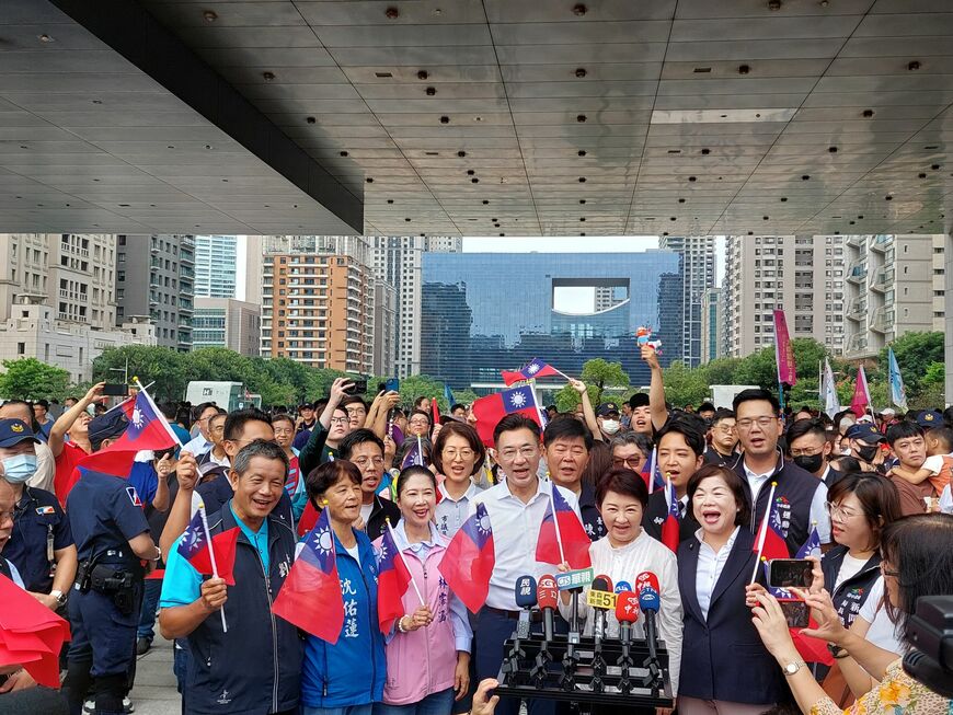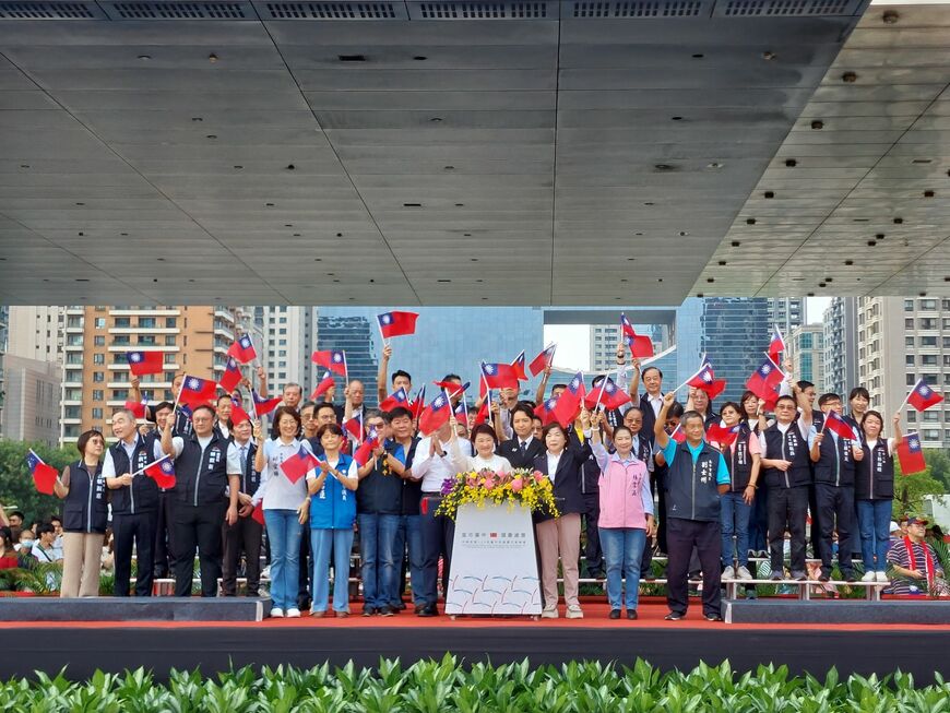 ▲ 台中市長盧秀燕帶領市府團隊首長,還有中央及地方民意代表共同揮舞國旗,共同慶祝屬於我們共同的國家 ‘’中華民國生日快樂‘’。圖/記者游穎達攝