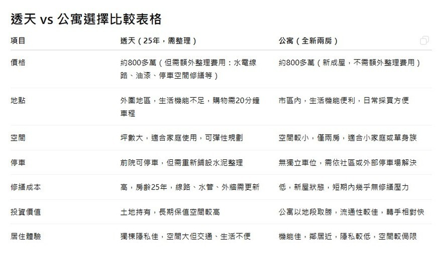 許多過來人分享經驗時指出,買透天要有心理準備,除了整修之外,偏外圍的地段代表通勤與日常生活的不便,這些隱性成本累積起來,不見得比市區公寓划算;而選擇市區新公寓,則意味著要接受空間有限,但生活品質卻相對穩定。這樣的抉擇,沒有標準答案,更多取決於購屋者對「生活型態」的想像與優先順位。