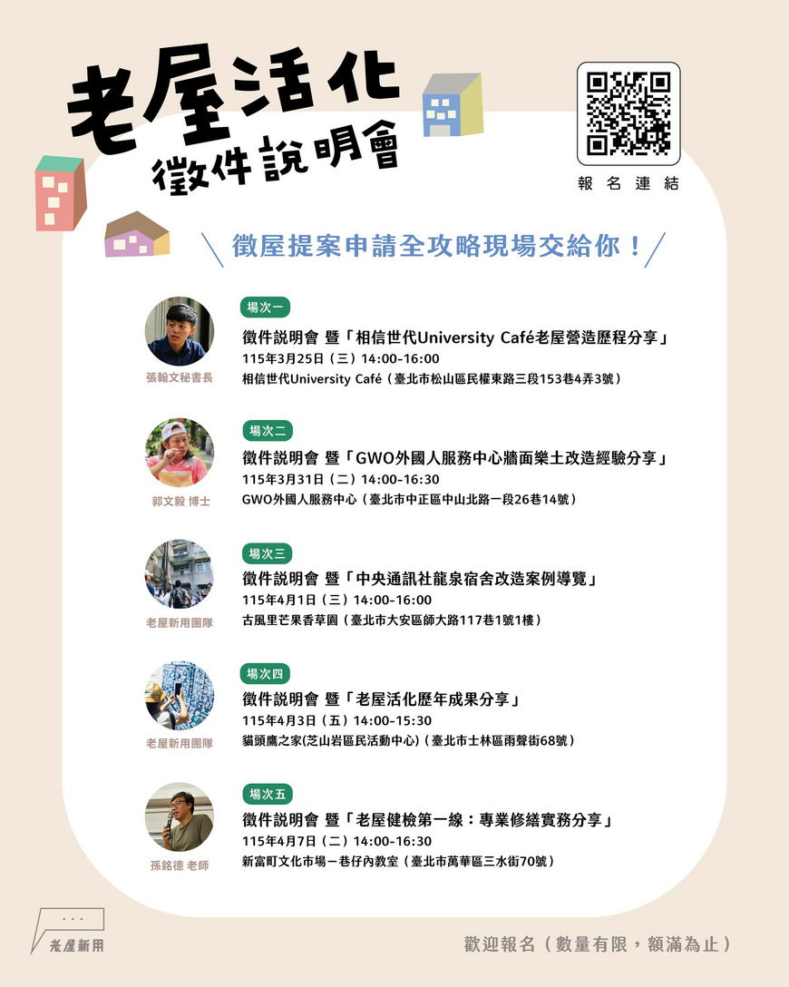 此外,為協助有意提案者了解計畫內容與申請方式,更新處於徵件期間共規劃5場徵件說明會暨專題分享活動,現場將詳細說明提案申請流程與計畫資源,協助市民朋友了解如何透過計畫參與老屋修繕及空間活化。如欲進一步了解老屋新用計畫或提案申請相關資訊,歡迎電洽計畫執行團隊城鄉潮間帶有限公司許先生 03-9359771分機23,或臺北市都市更新處吳小姐02-2781-5696分機3818。