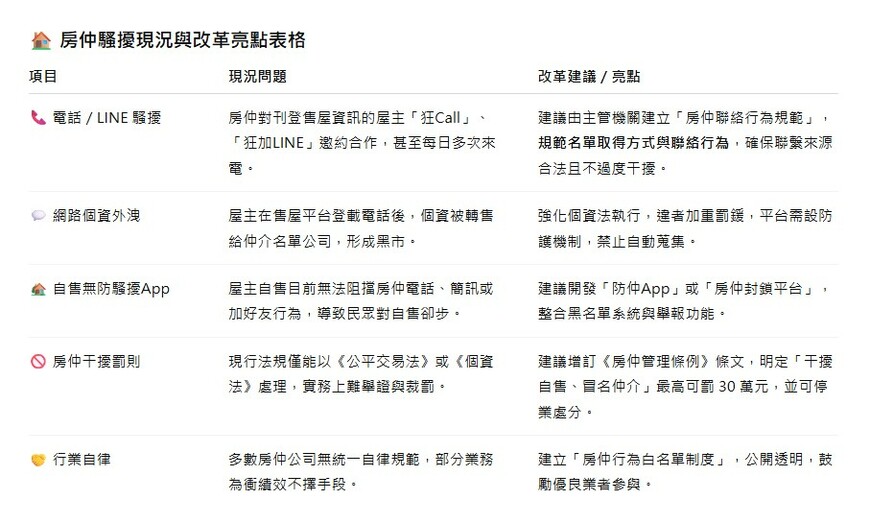 近來民間呼籲聲浪漸起,主張應明訂「房仲防騷擾條款」,明確規範房仲不得未經屋主同意主動聯繫,並建立檢舉與罰鍰機制。