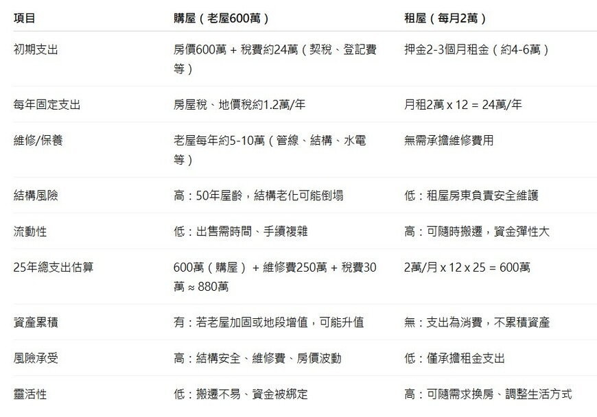 從租屋角度來看,網友提到的每月2萬元租金,若持續25年,總支出約600萬,恰好與購屋成本相當。
