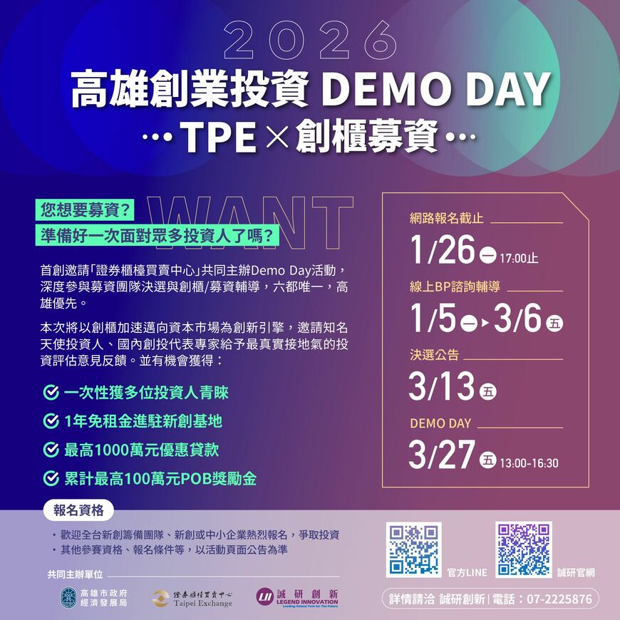 加速高雄潛力新創獲資本青睞!年度指標性全國創業活動「2026 高雄創業投資DEMO DAY | TPEx創櫃募資」第三屆開跑,協助創業團隊精準對接資本市場、取得關鍵資金與人脈、加速企業成長。2026年活動將全面升級,首度攜手證券櫃檯買賣中心(TPEx),導入完整的資本市場制度資源,整合創櫃板機制、投資實務與實戰型BP簡報訓練,協助企業站上資本舞台。報名時間自即日起至1月26日止,歡迎新創與中小企業踴躍報名。