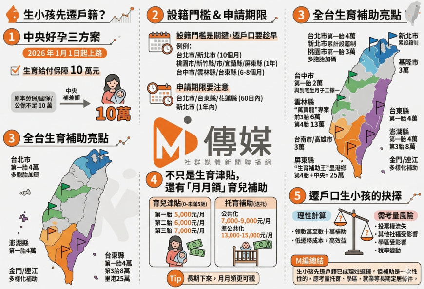 「生小孩先遷戶籍」已成為台灣年輕爸媽的理性選擇。在中央10萬元保障的基礎上,各縣市生育津貼從數萬元到數十萬元不等,差距之大足以影響家庭決策。