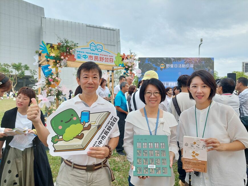 ▲ 本報記者實際參與「市民野餐日」現場活動採訪,並與最具「台中綠美圖」代表人物的中市總圖書館長曾惠君(圖中)、台中美術館長賴依欣(圖右),共同為今年主題「草地閱讀趣・一起野餐去」共同開心代言。(圖/中市建設局協助拍攝)