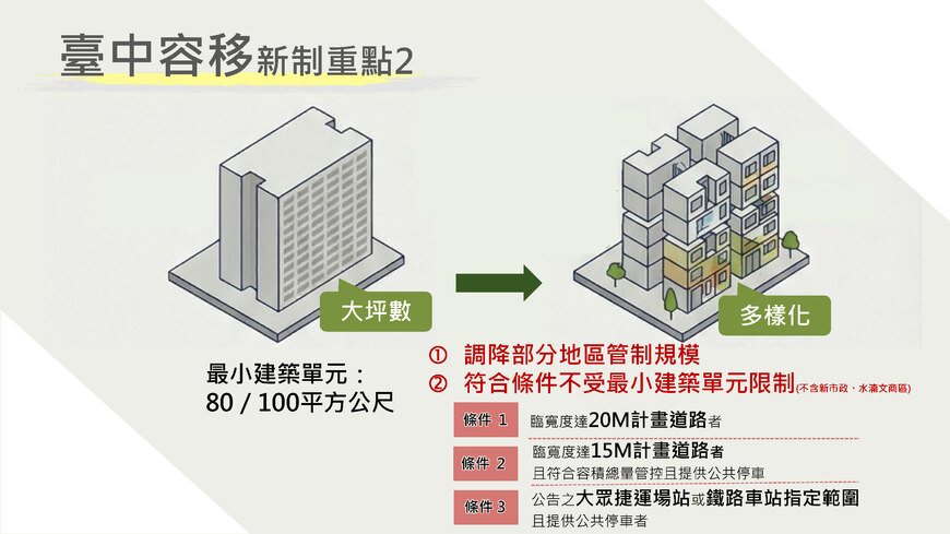 李局長指出,為提升建築規劃合理面及避免對都市涵構產生重大衝擊,台中市對容積移轉接受基地特有規範,訂有「最小建築單元」(即限制房屋專有面積需達80或100平方公尺)規定。但考量現今青年首購需求增加,都發局在確保基地臨路條件、容積總量管控及大眾運輸導向發展等前提下,適度放寬此項限制,預期可提升住宅市場產品的多元性,將有助於減輕青年族群購屋的門檻,提升土地利用效率。