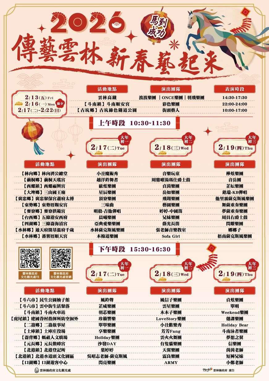 「雲林新春藝起來」系列活動於2月13日(五)下午在高鐵雲林站率先展開,由波波樂團、ONCE樂團及羽飛樂團接力開唱,為返鄉學子與遊客洗去奔波疲憊。除夕夜(2月16日)則由斗南順安宮接棒,晚上10時於廟前舉辦「除夕迎新春歡喜開廟門」,由彩色樂團擔綱演出,透過溫暖的歌聲與音樂,陪鄉親一同倒數辭舊迎新,感受傳統宗教與現在藝文交織的節慶魅力。緊接著,新春期間2月17日至2月22日,活動延伸至深受遊客喜愛的古坑鄉綠色隧道公園,每日安排多組街頭藝人輪番演出,表演內容涵蓋樂器演奏、書法創作、油畫展示及手工藝等多元藝術形式,讓民眾在綠蔭環繞的自然景觀中,近距離感受生活藝術之美,為新春假期增添悠閒又富文化氣息的漫遊體驗。